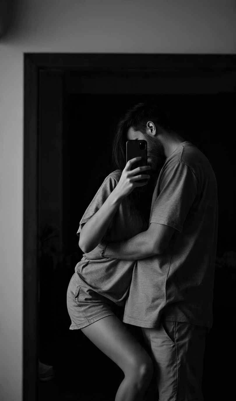 He stepped up behind her, sliding an arm around her waist. "I'm going to put my hands on your hips. You hold the phone with both hands and look at me. Don't move until I say so. Got it?"